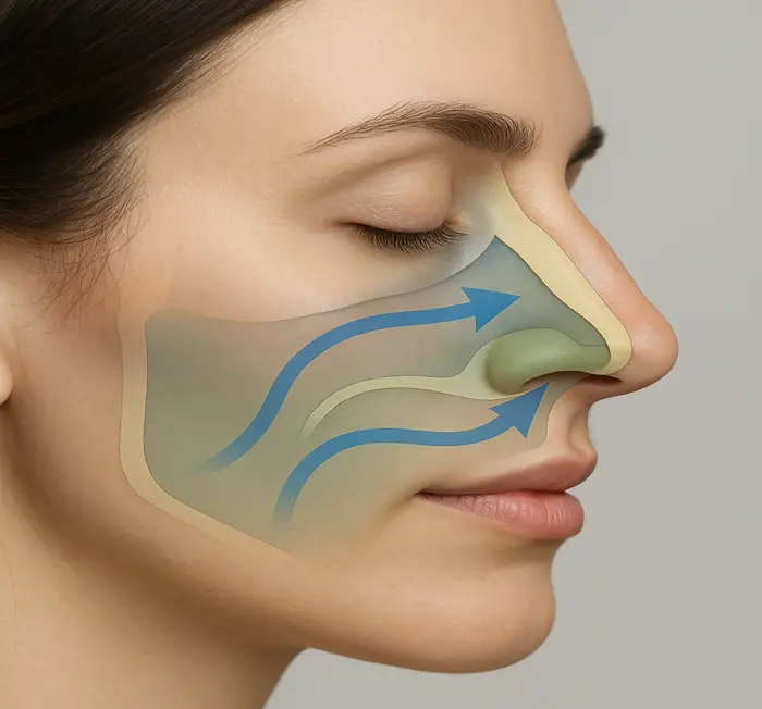 Nasal obstruction plays a crucial role in sleep-disordered breathing. When nasal passages are blocked or narrowed, the body compensates by breathing through the mouth. This creates several problems: mouth breathing promotes throat tissue collapse, reduces oxygen intake efficiency, and can worsen sleep apnea symptoms.